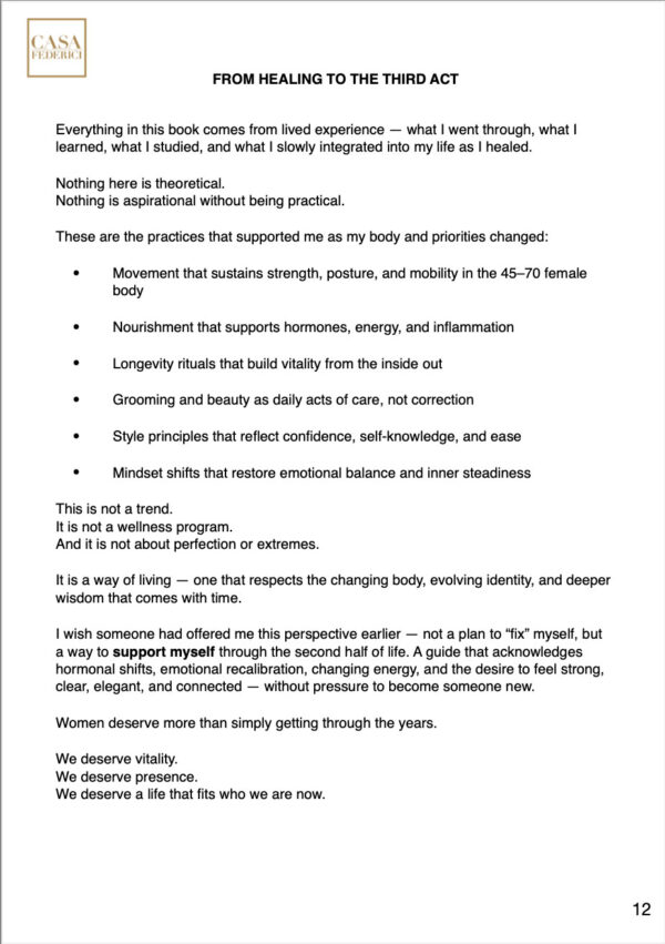Aging Gracefully is a holistic roadmap designed for women 45+ who want to feel strong, confident, radiant, and deeply connected to themselves as they move through the second half of life. Blending science-backed wellness with daily rituals, personal style, mindset work, and practical routines, this guide offers a realistic and inspiring approach to aging well — from the inside out.