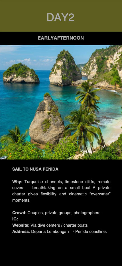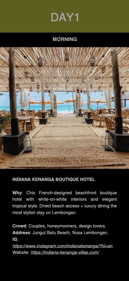 Just offshore from Bali, Nusa Lembongan and Ceningan offer an effortless sense of freedom — mornings shaped by the ocean, afternoons spent between beach clubs and cliffside viewpoints, and evenings that melt into golden light. Life moves simply here, guided by tides, breeze, and barefoot moments.