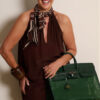 The short neck-tie dress in rust and forest green is a playful yet polished staple. Its breezy silhouette is elevated by a printed neck tie, exclusive to our Bali collection, adding a touch of island sophistication to every step.