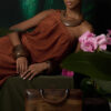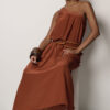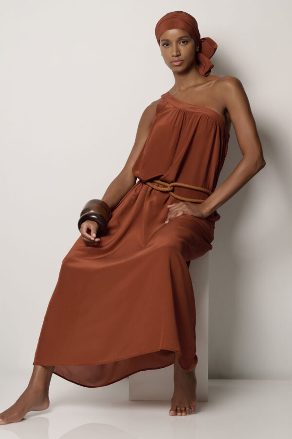 Our signature one-shoulder dress in sun-warmed rust is a timeless statement in effortless elegance. Designed to flatter, flow, and move with you from golden hour to evening soirées.